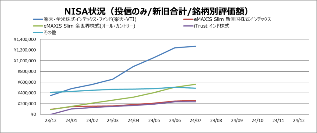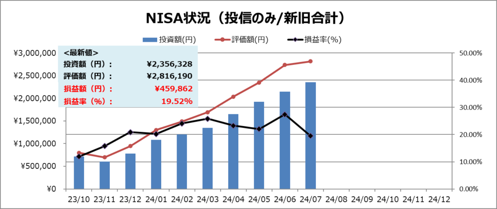 | 新NISA (投資信託のみ) | 2024/07 | ¥1,575,000- | ¥1,684,829- | ¥109,829- (6.97%) |
